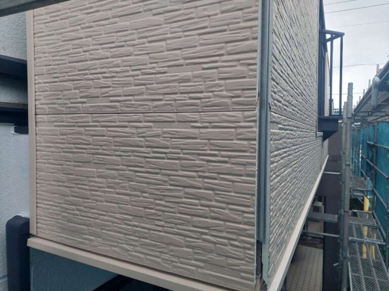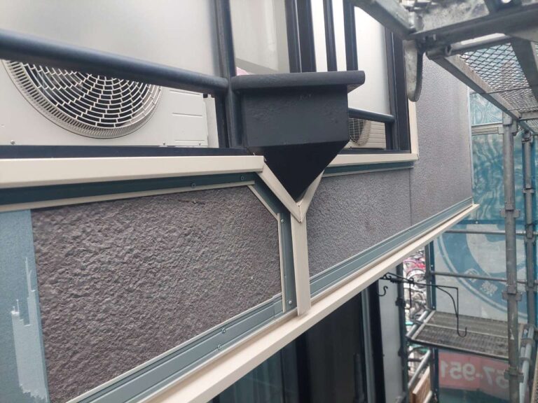 出隅役物を設置し、取り合いにシーリング処理を行います。