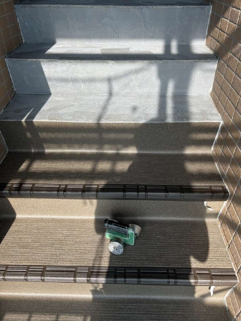 | 仕様 | 北面看板フレーム:15-50B 外壁 RC 面、腰壁スリット金物、雨樋、バルコニー隔て板、 AC ダクトカバー:17-40D 軒天(廊下・階段・小庇):17-70B 玄関枠部、PS ドア・枠部、1階鉄扉・枠、計器 BOX 等(既存白 系)、ゴミステーション: 15-30B 計器 BOX(既存茶系):22-85B 金属屋根(西面1階、塔屋):N-75 受水槽:22-85B ・南面ポンプ庫:22-70B 防滑シート: タキロン 階段:8W-837 床: NA 837 基礎:セメント色 |