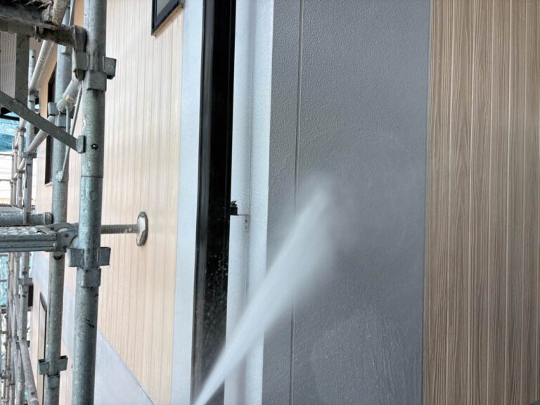 高圧洗浄により外壁汚れを落としていきます。