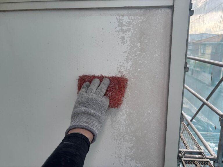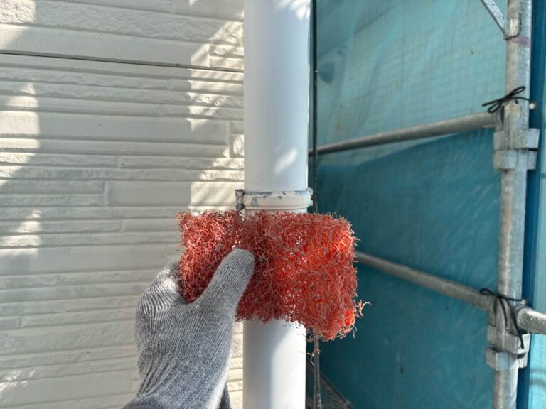 高圧洗浄を行い、汚れを除去します。その後、非塗装箇所に養生を行い、塗料の付着を防ぎます。
